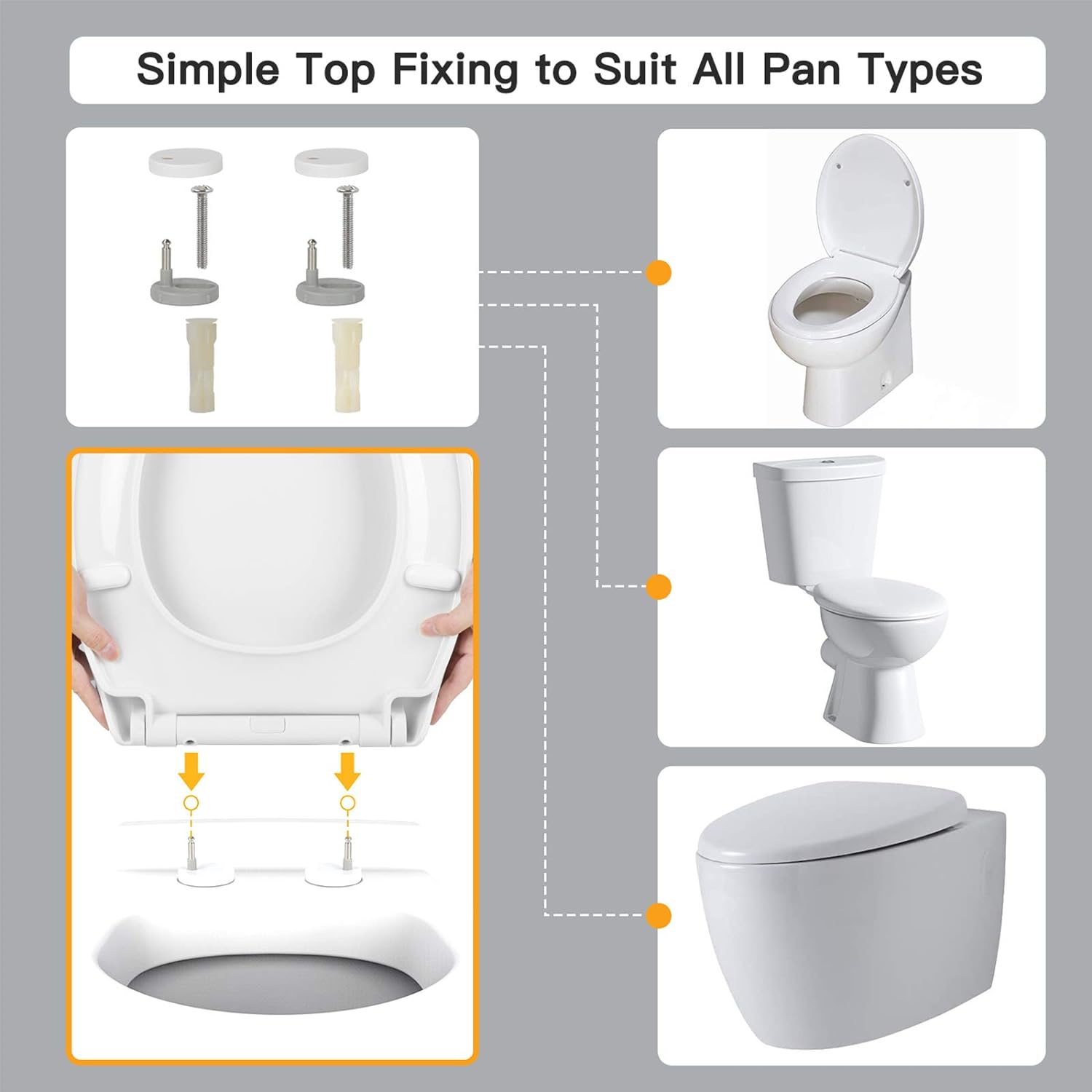 Universal Comfort: This modern, white toilet seat fits most standard oval-shaped toilets, seamlessly integrating into your existing bathroom. Installation is a breeze thanks to the top-fixing design, allowing for a perfect fit and easy adjustment.