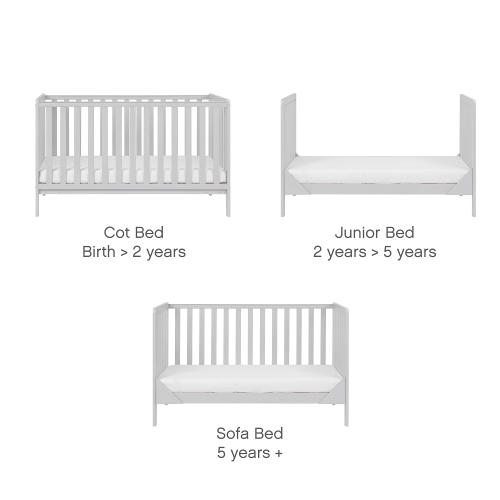 A modern Scandinavian inspired cot bed with matching cot top changer & mattress. Converts to junior bed and sofa/day bed offering all your nursery essentials in one affordable and stylish package. Three position mattress height with fixed side rails & protective teething rails, Cot Top Changer attaches securely on the top of the cot bed to provide comfortable changing facilities, Mattress is made from hypoallergenic, breathable materials with washable cover.