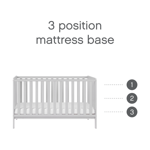• 3 position adjustable mattress base - allows you to lower the height of the mattress as your baby learns to sit and stand.