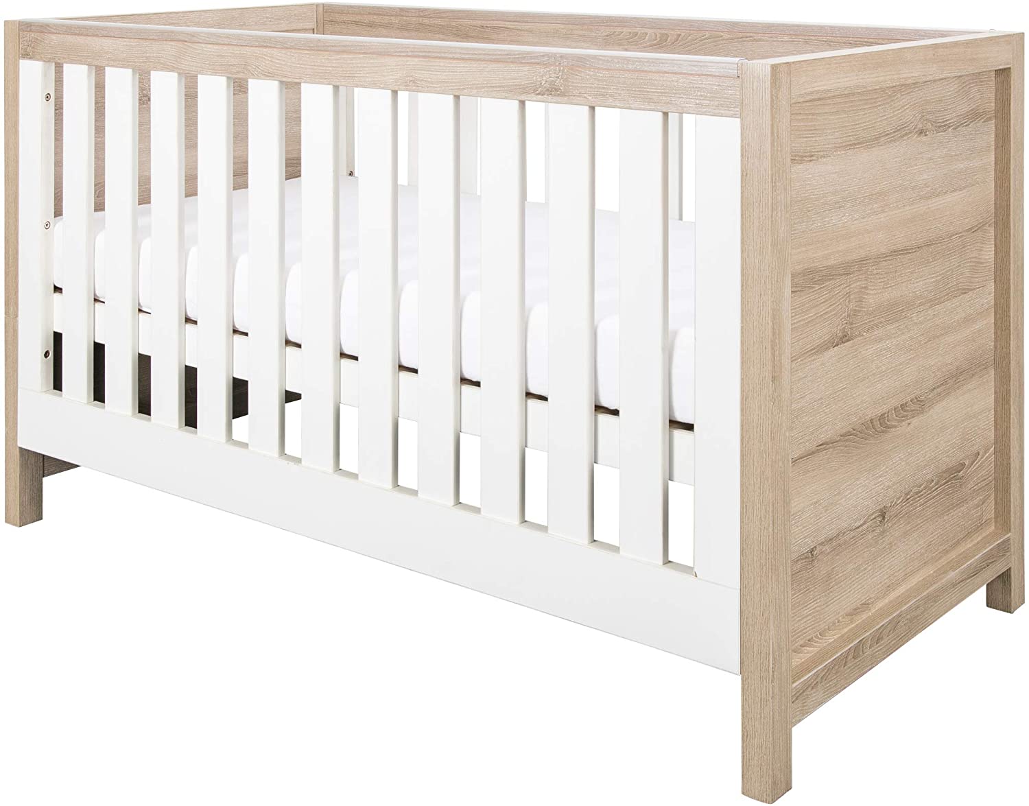 The Modena Cot bed has a beautiful contemporary design combining a classic oak finish with modern white detailing. The Modena converts into a toddler bed and sofa bed making it the perfect choice for any nursery designed to grow with your little one.j