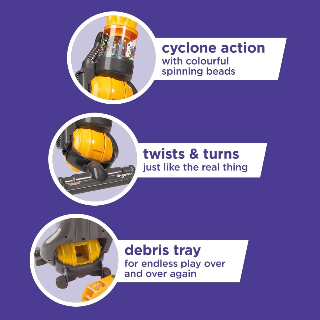 Complete Set: The toy includes the Dyson Ball with twist-and-turn action, removable debris drawer, whizzing coloured balls, and sound effects, making it the ultimate pretend play vacuum for your child.
