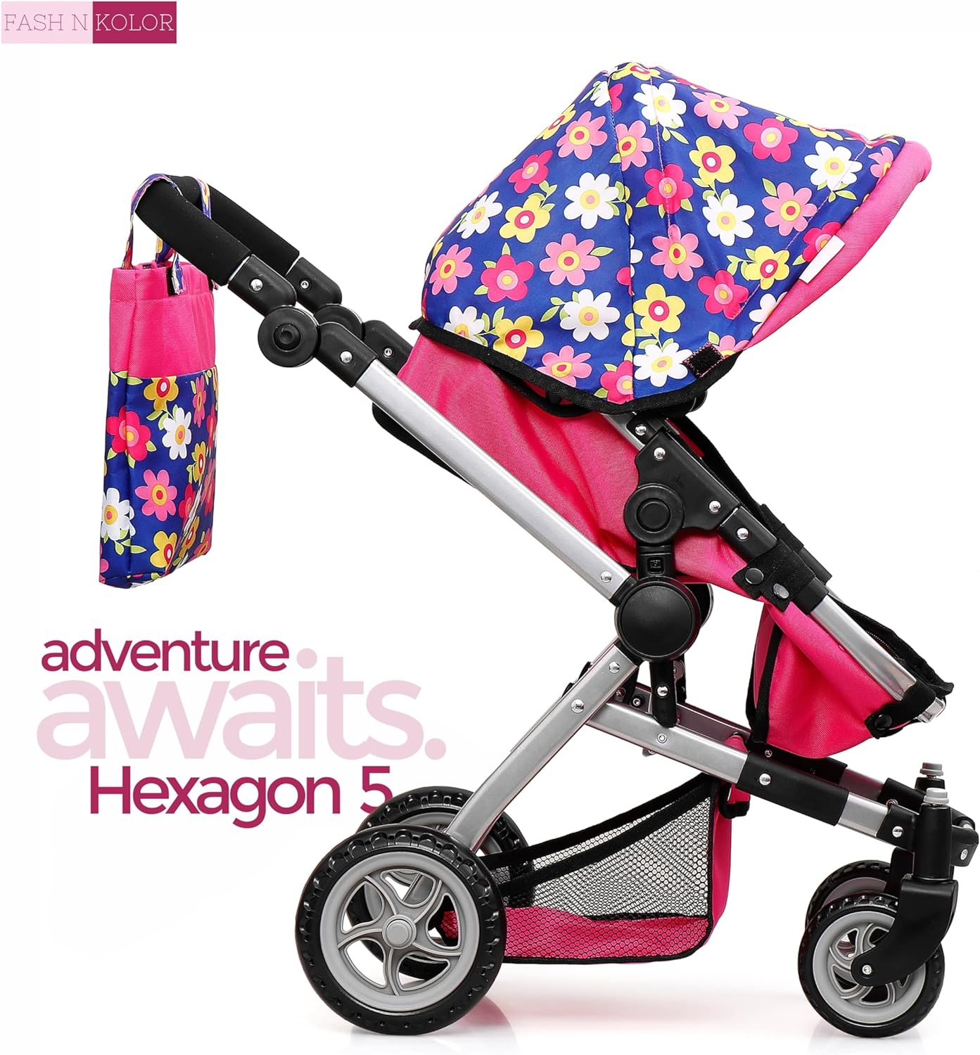Fash N Kolor | Foldable Pram for Baby Doll with Flower Design with Swiveling Wheel Adjustable Handle Bassinet Stroller with Baby Doll, Convertible Seat, and Basket, and Free Carriage Bag