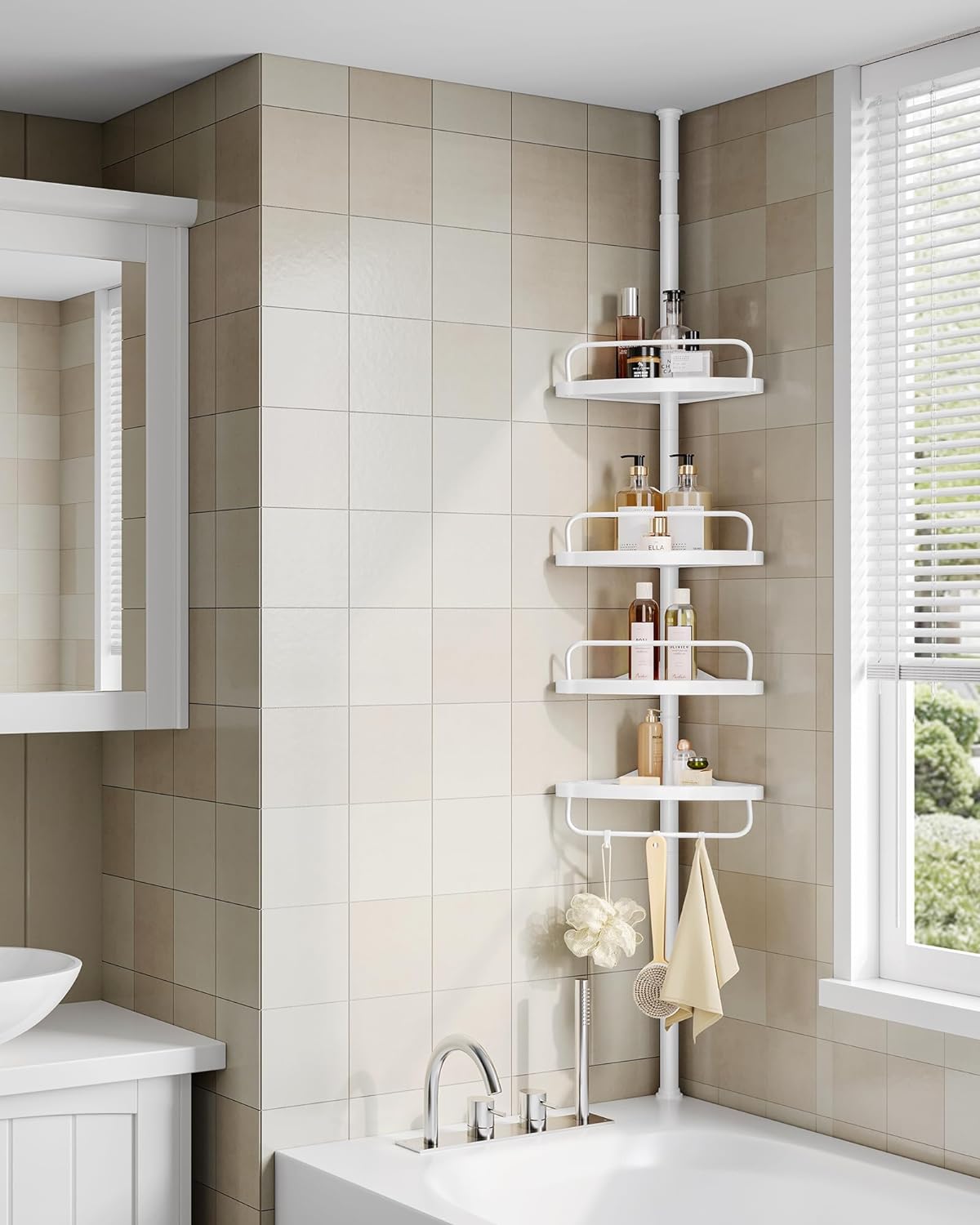 - Featuring 4 adjustable shelves and 3 integrated hooks, this shelf provides ample space for all your shower essentials, from shampoos and conditioners to loofahs and razors.