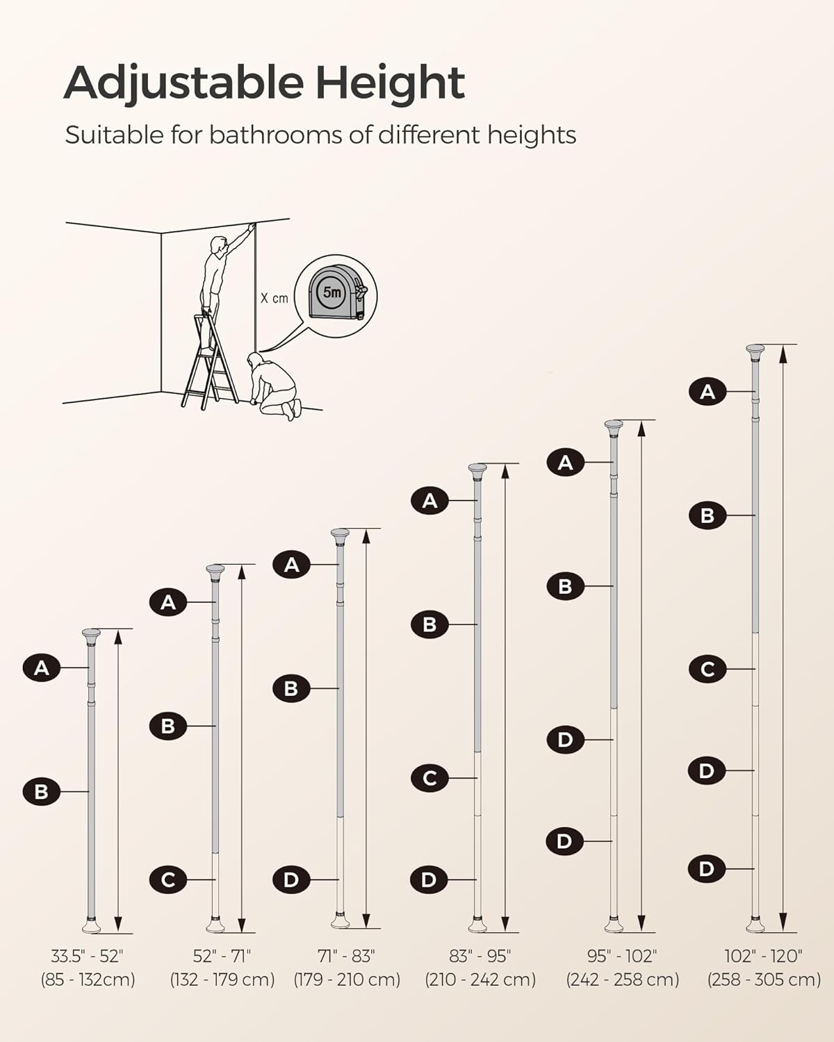 - This innovative shelf is height-adjustable between 85cm and 305cm, making it a perfect fit for bathrooms of all sizes.
