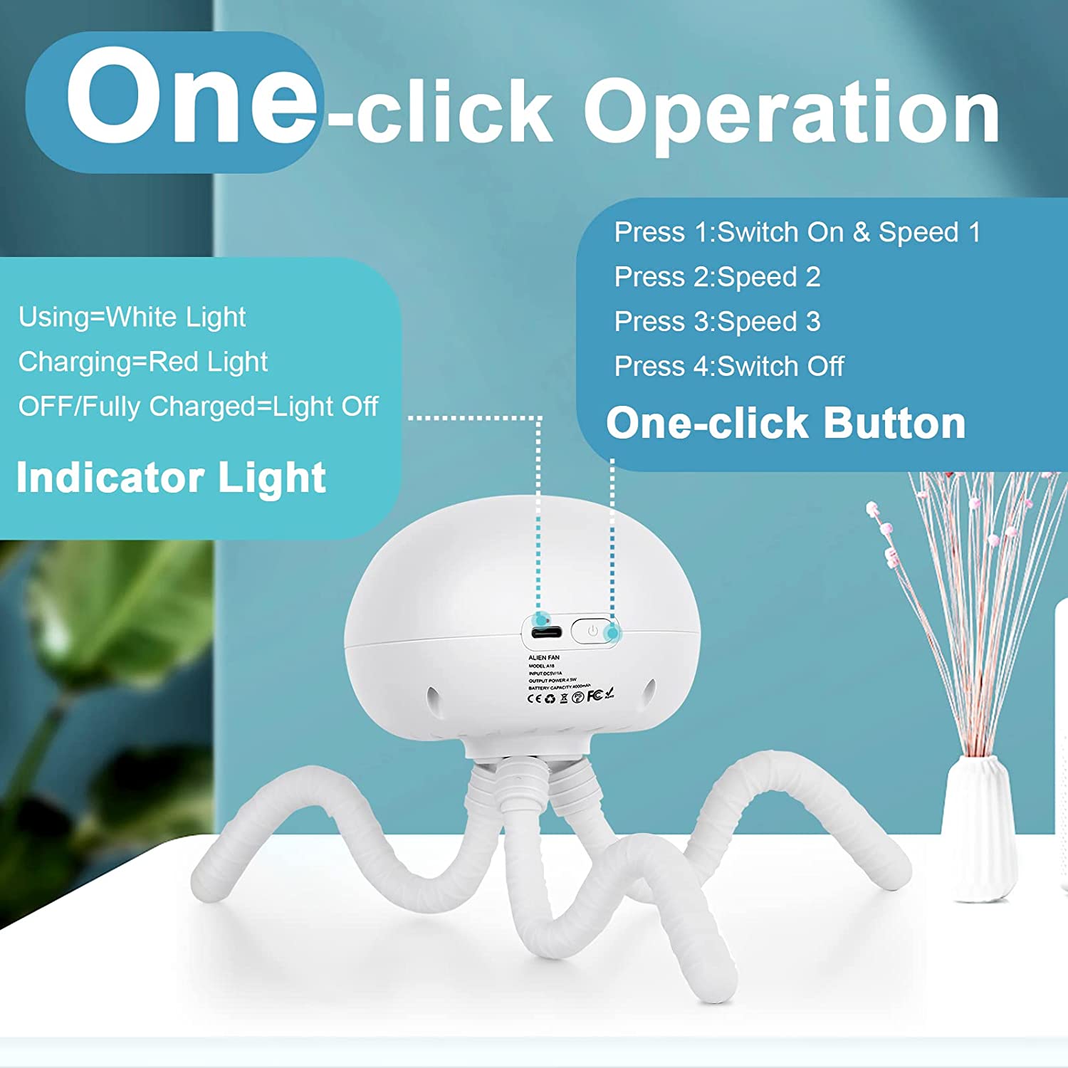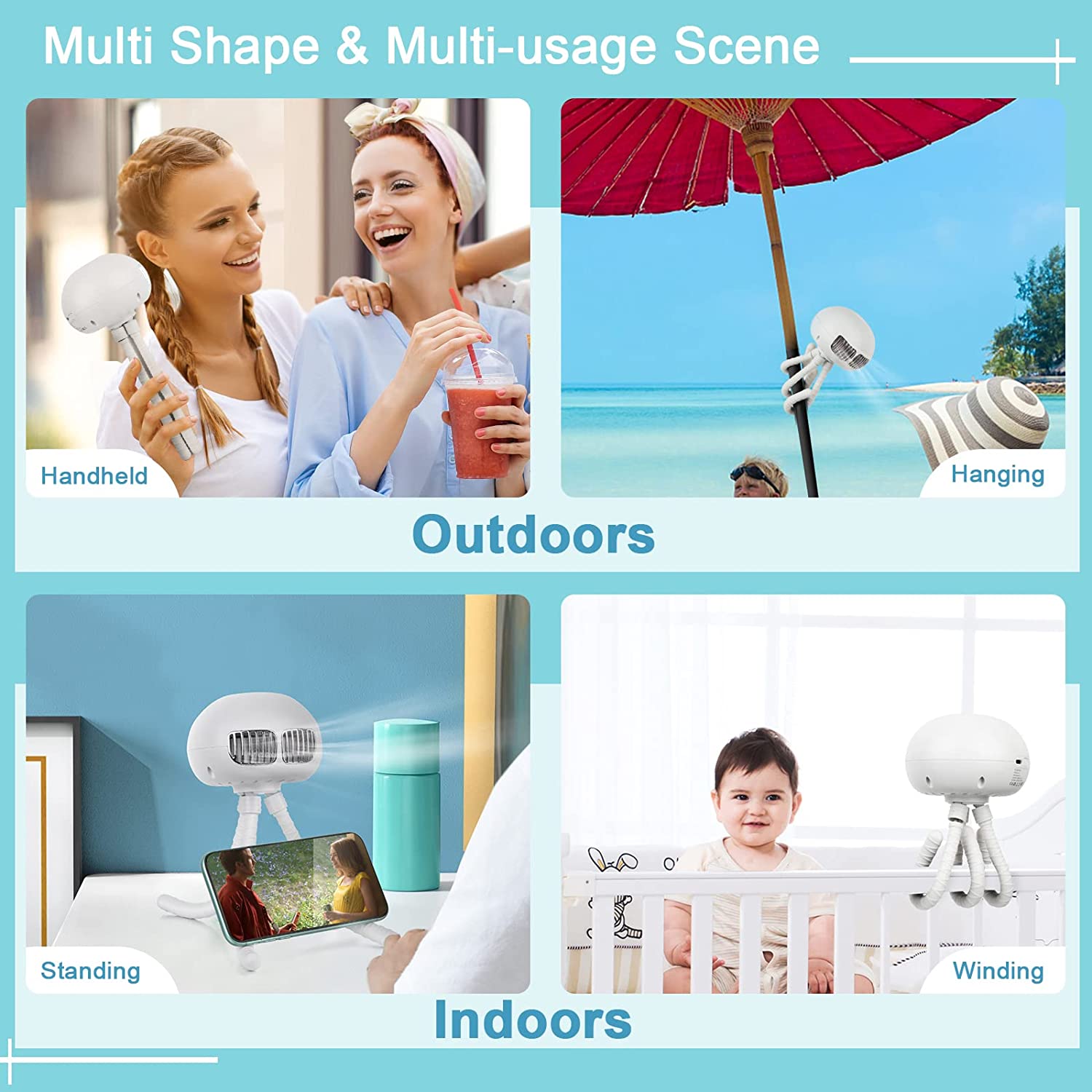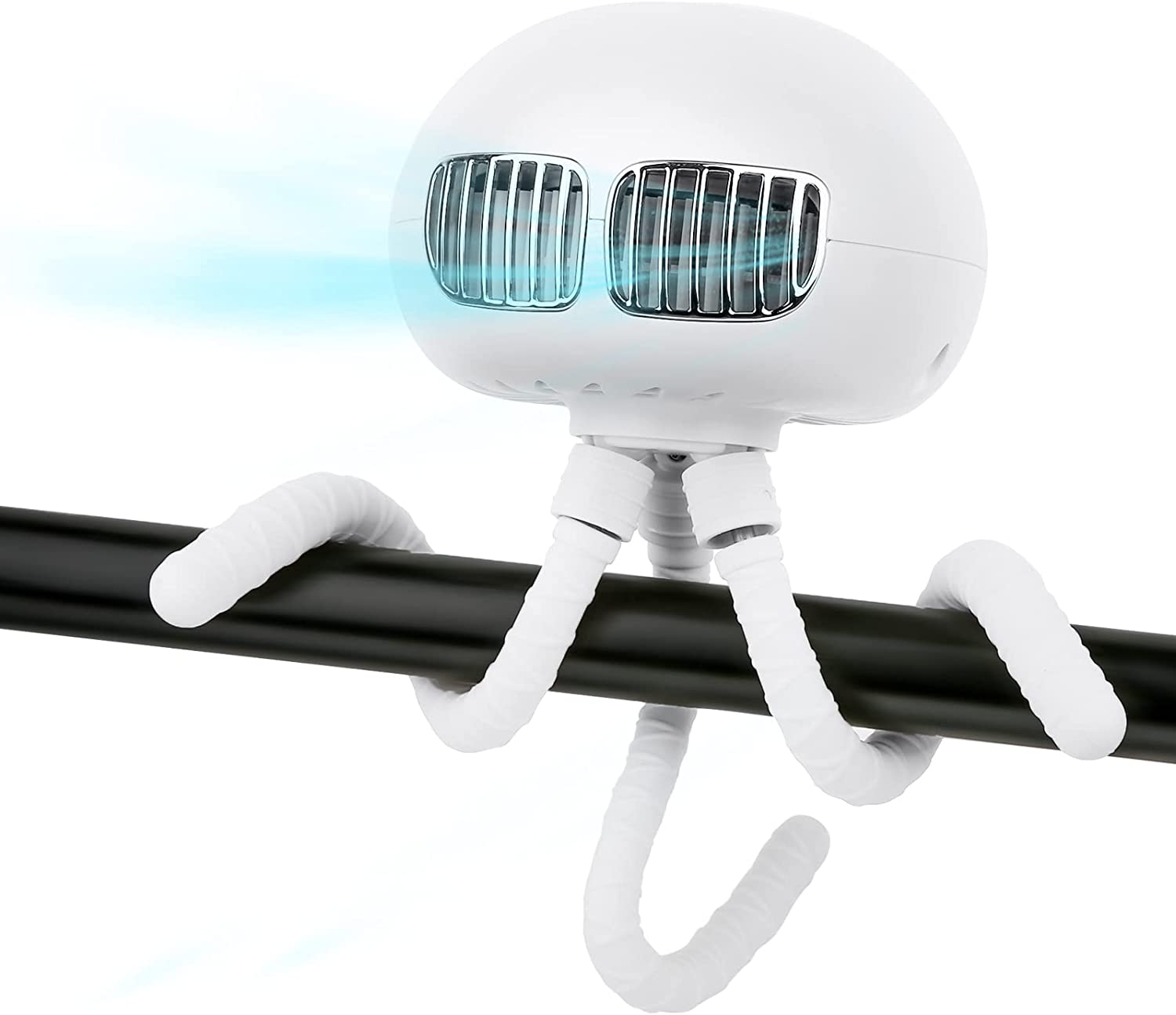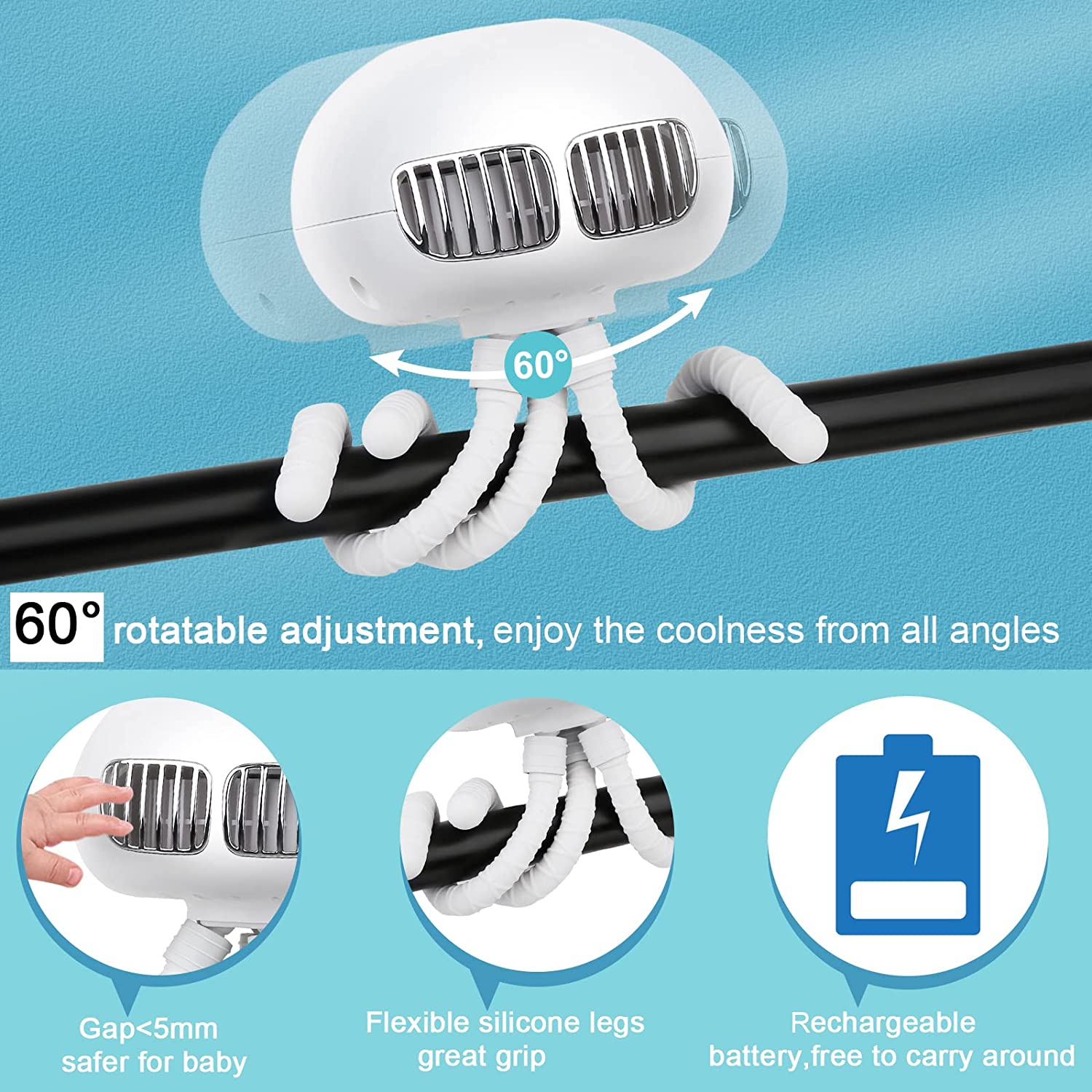 - Flexible Octopus Tripod & Multipurposed Shape: Three silicone legs provide great grip to hold the stroller fan safely. You can handheld it while walking; hang it on the support of a camping tent or umbrella; wrap it around on baby stroller, cribs, car seats or bicycle; or stand it on the desktop and even put your cellphone on its deformed feet as a phone stand to watch movies.