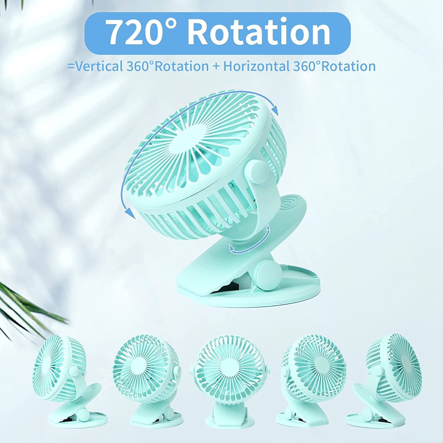 - Rechargeable & Portable: This clip-on fan is equipped with a built-in rechargeable battery for a good battery life. Fully charge for 6 hours and can work up to 11.5 hours under breeze wind mode. The using time is about 11.5h at Speed 1; 7h at Speed 2; 5h at Speed 3) .The fan is quiet on the Speed 1 and quite strong on the Speed 3.