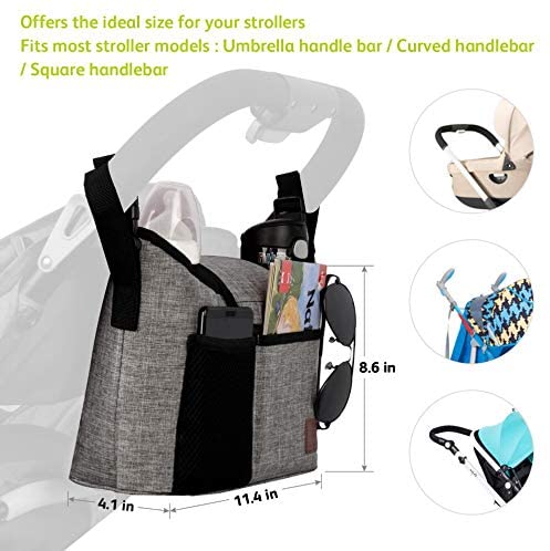 - ★LARGE SPACE STROLLER ORGANISER FOR BUSY LIFE-Approx. 11L volume with 2 deep drink holders for standard 500ML water, coffee or milk bottles, besides, you can put 3-4 diapers, 1x wipes, 1x baby body lotion, 2x phones, 2x small toys, keys, snacks, 1x wallet, 1x ipad or book in this smart pushchair organiser bag.