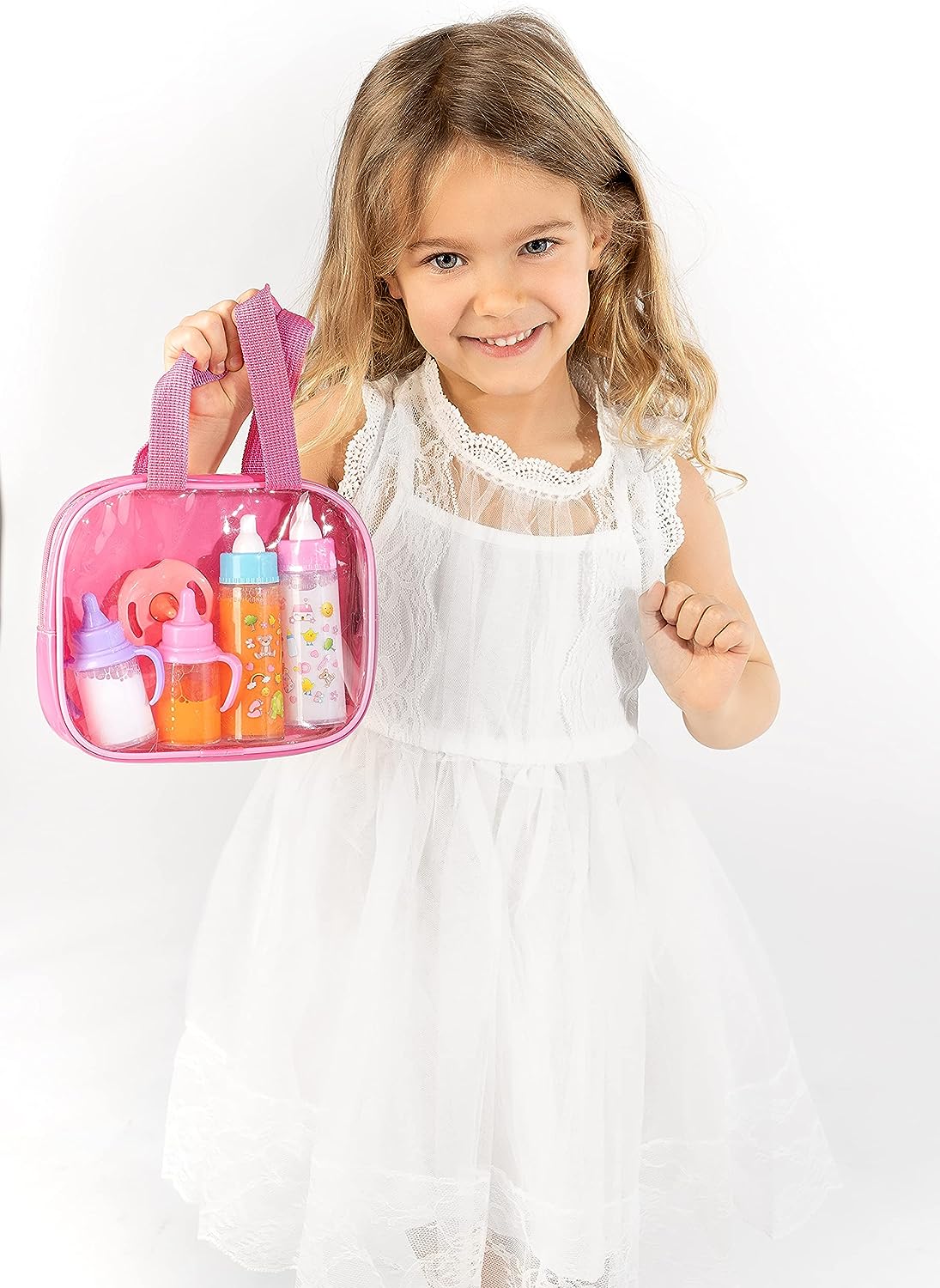 - Interactive & Colorful Design For Kids: Our Baby Doll Care Set With Baby Bottles Comes In A Zippered See Through Toy Bag That Is Ideal For Doll Carriers So Your Little Toddler Can Enjoy Hours Of Pretend Play. Designed With Cute And Colourful Images To Entertain Young Minds, This Feeding Baby Doll Set Will Spark Your Child'S Imagination