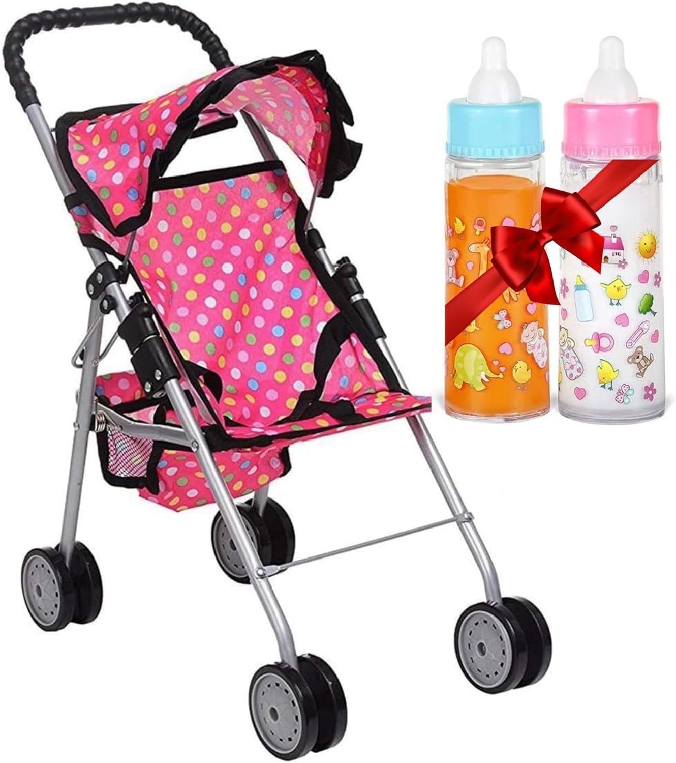 fash n kolor Doll Stroller with Basket - My First Baby Doll Umbrella Stroller - Pink Polka Dot Foldable Doll Pram Baby Doll Accessories Gift Toys for Girls with 2 Free Bonus Bottles