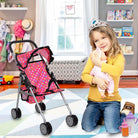 - POLKA-DOT BABY DOLL STROLLER DESIGN: Delight your child with this adorable pink polka dot doll stroller, complete with a convenient basket. The eye-catching design makes playtime even more fun. Make your little princess's dreams come true with this Baby Doll Stroller, providing hours of pretend play fun. This stroller is portable, easy to unwind and assemble, and won't take up much space at home. Equipped with a shopping basket.
