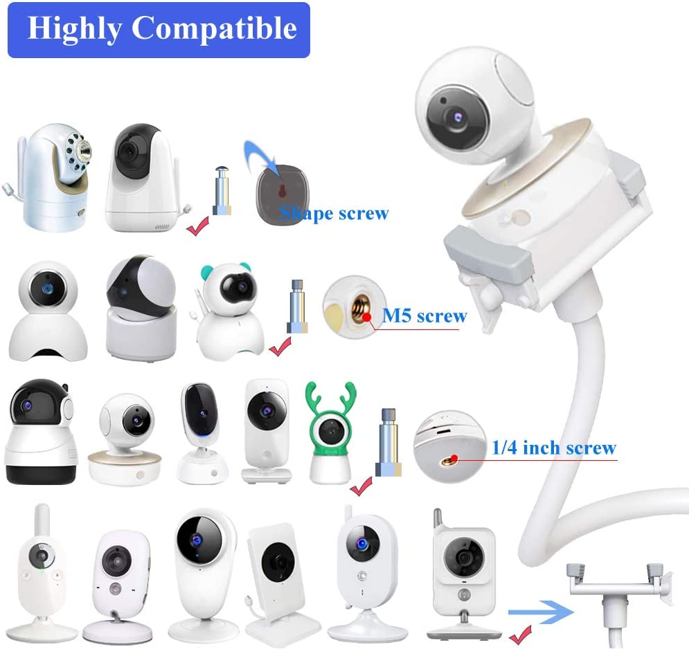 - Multiple installtion methods:You can directly use the camera clip to fix the camera (the diameter of the bottom of the camera is 58mm to 85mm), you can turn the spring screw according to the size of the camera to adjust the "tightness".Use the accessory base to match the (M5 threaded holes and shape screw 1/4 threaded holes)The mount is designed for most of baby monitors in market which camera has a a base or hole at the bottom.