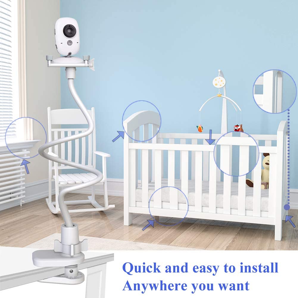 - Easy to use,no sticking no drilling: This baby camera mount has a strong clamp that holds securely to most surfaces of furnitures; The baby video camera is firmly affixed within the clamp and supported by a rubber silicone strip.