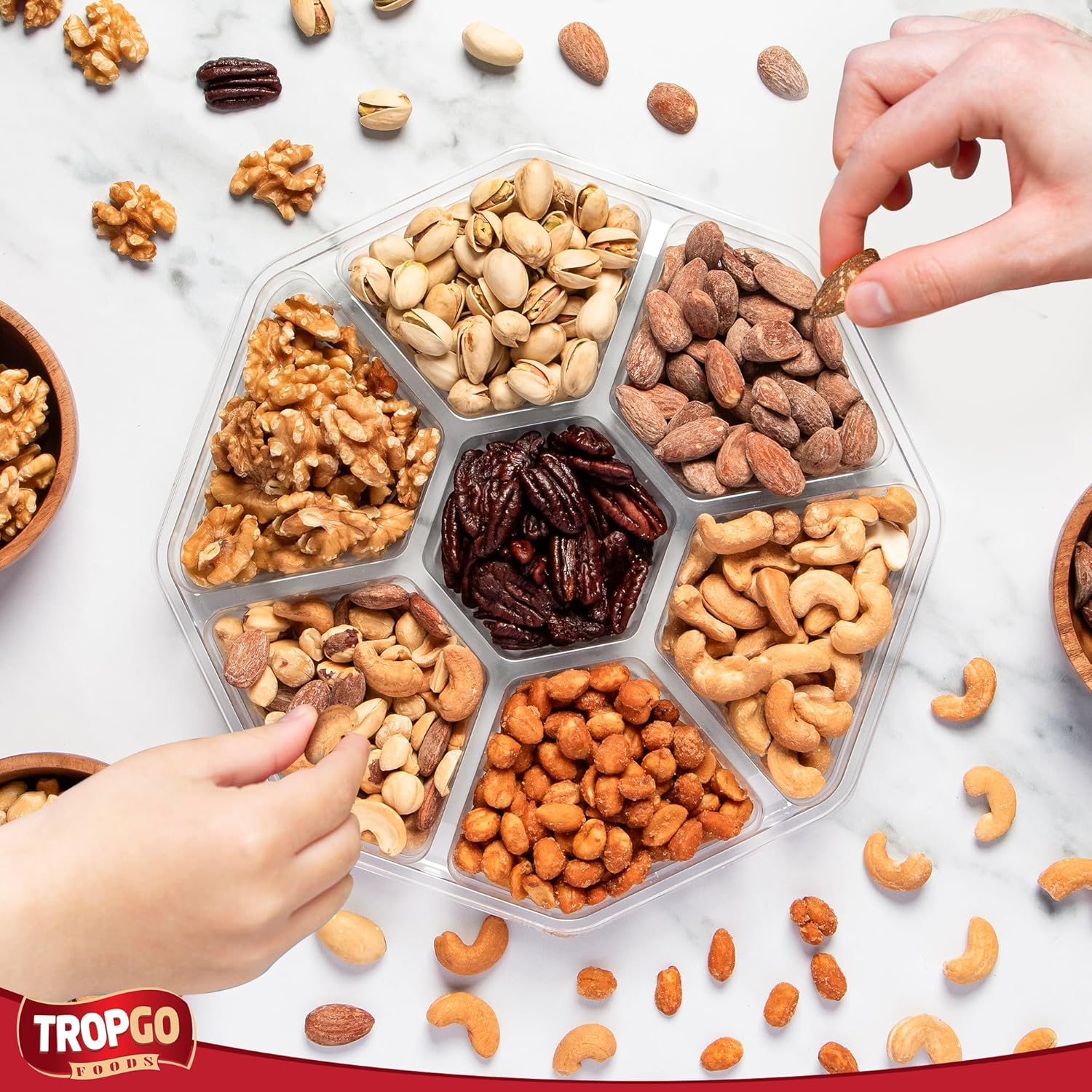 - BEAUTIFUL PACKAGING WITH GIFT BOX - High-end packaging featuring a unique and sophisticated design. Plus, our nuts come in a sturdy, and clear 7 sectional hexagon-shaped tray wrapped in a gift box, that makes it elegant and easy for you to gift the arrangement to the people you love.