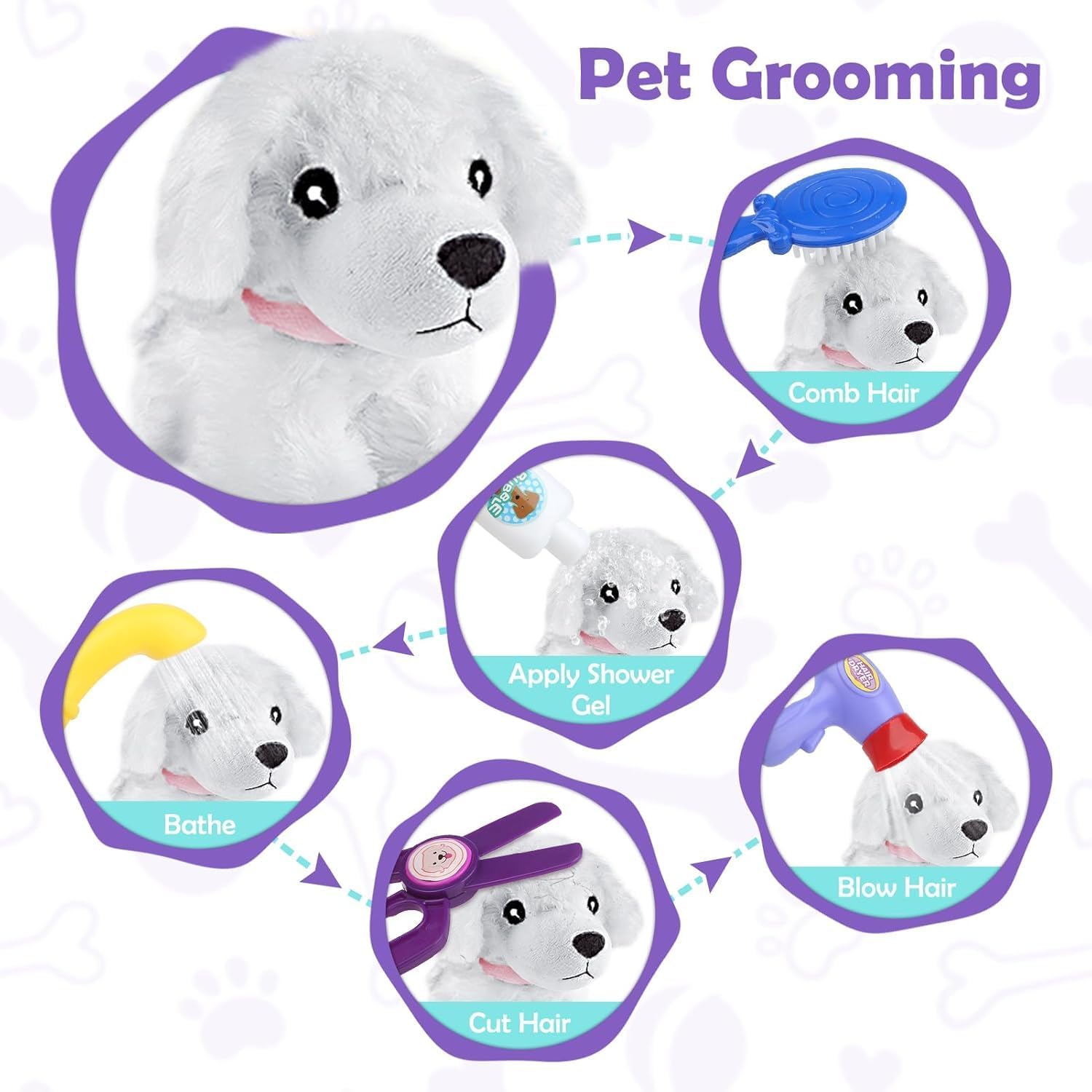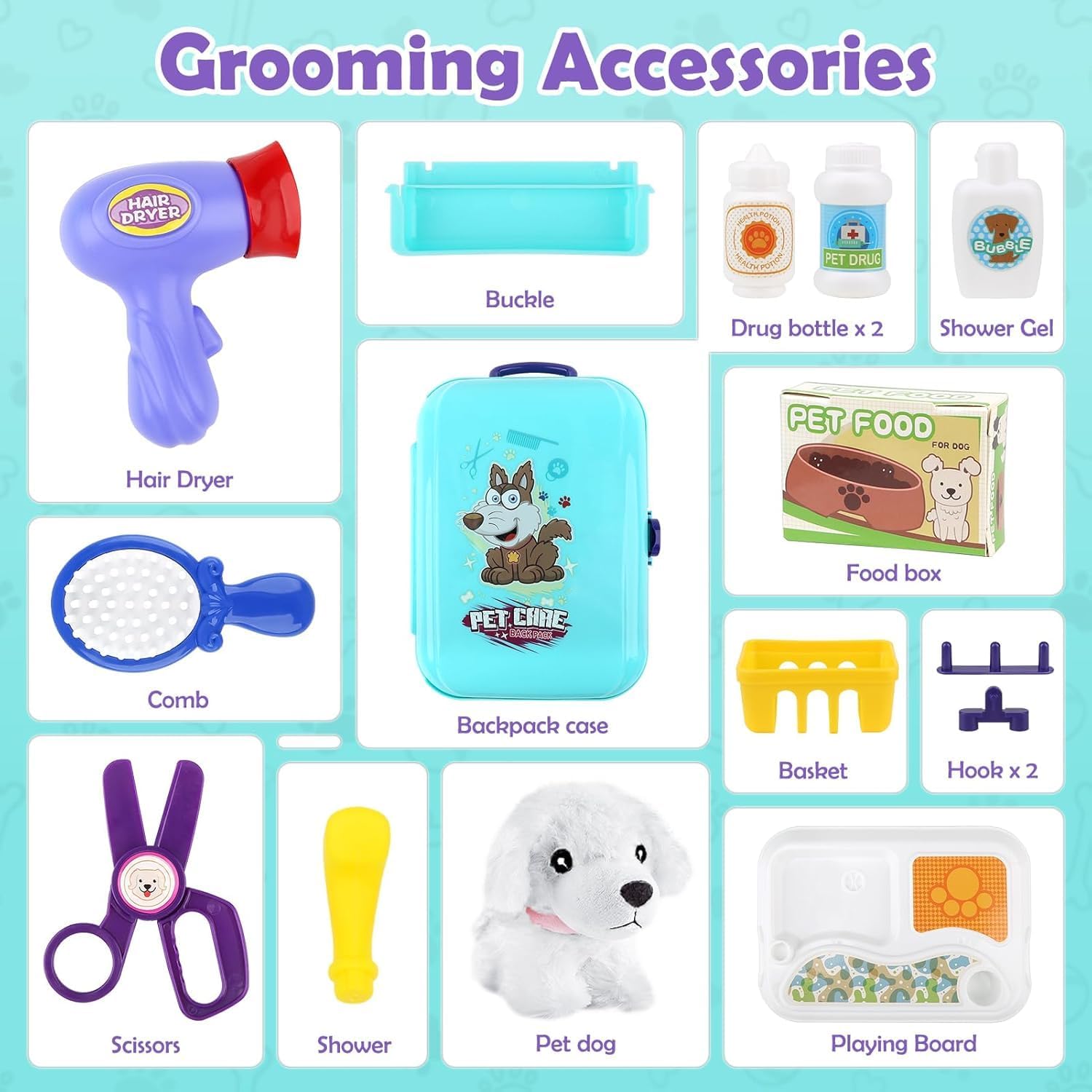Kids Pet Care Vet Playset - 16-Piece Puppy Grooming & Feeding Toy Kit with Plush Dog, Accessories, and Backpack - Pretend Play Vet Role for Boys & Girls Ages 3+