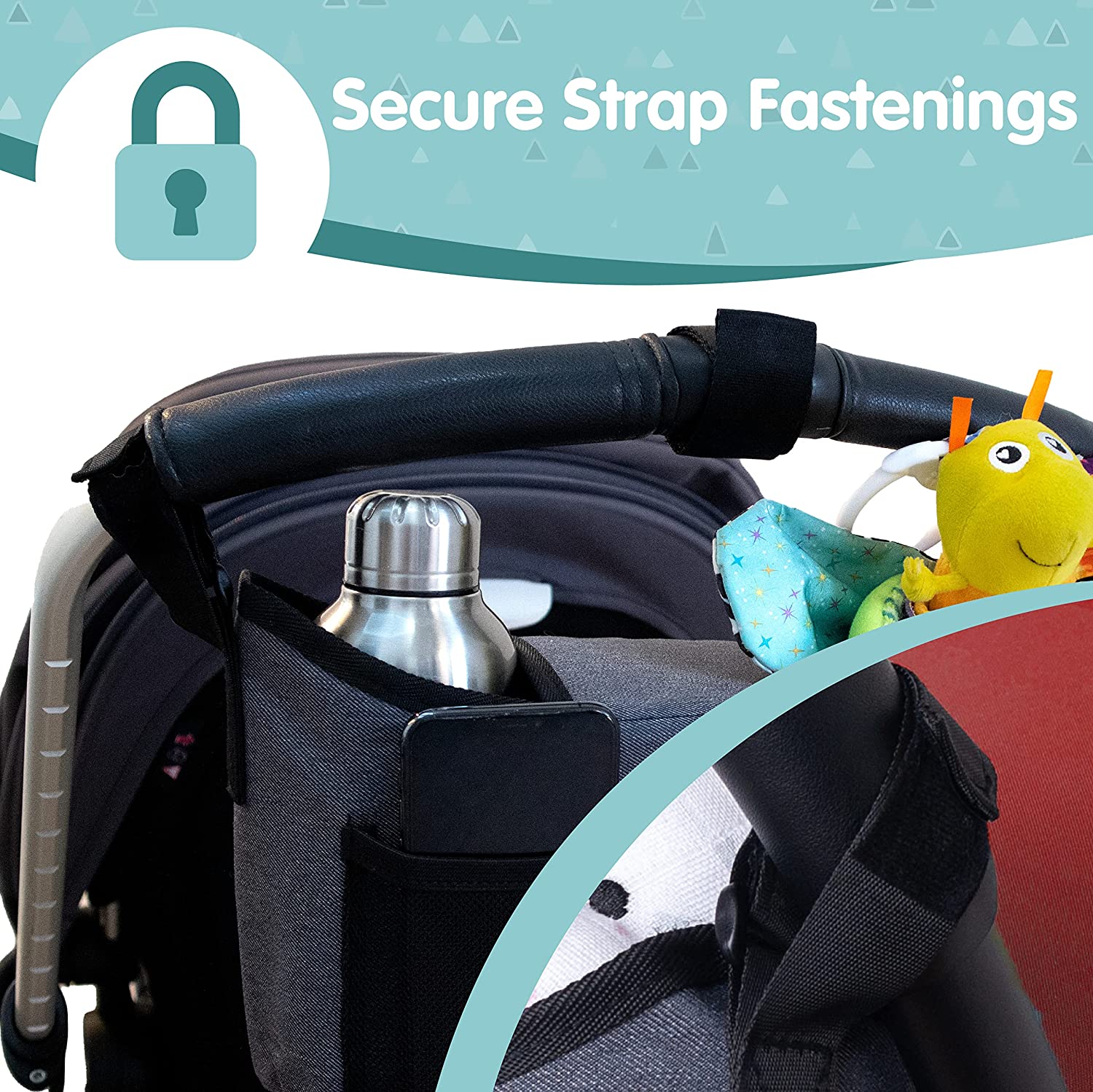 - [ EASY TO INSTALL ] - Securely attach this stroller organiser bag to your buggy handles using the sturdy straps - designed to fit all types of prams, caddies and pushchairs
