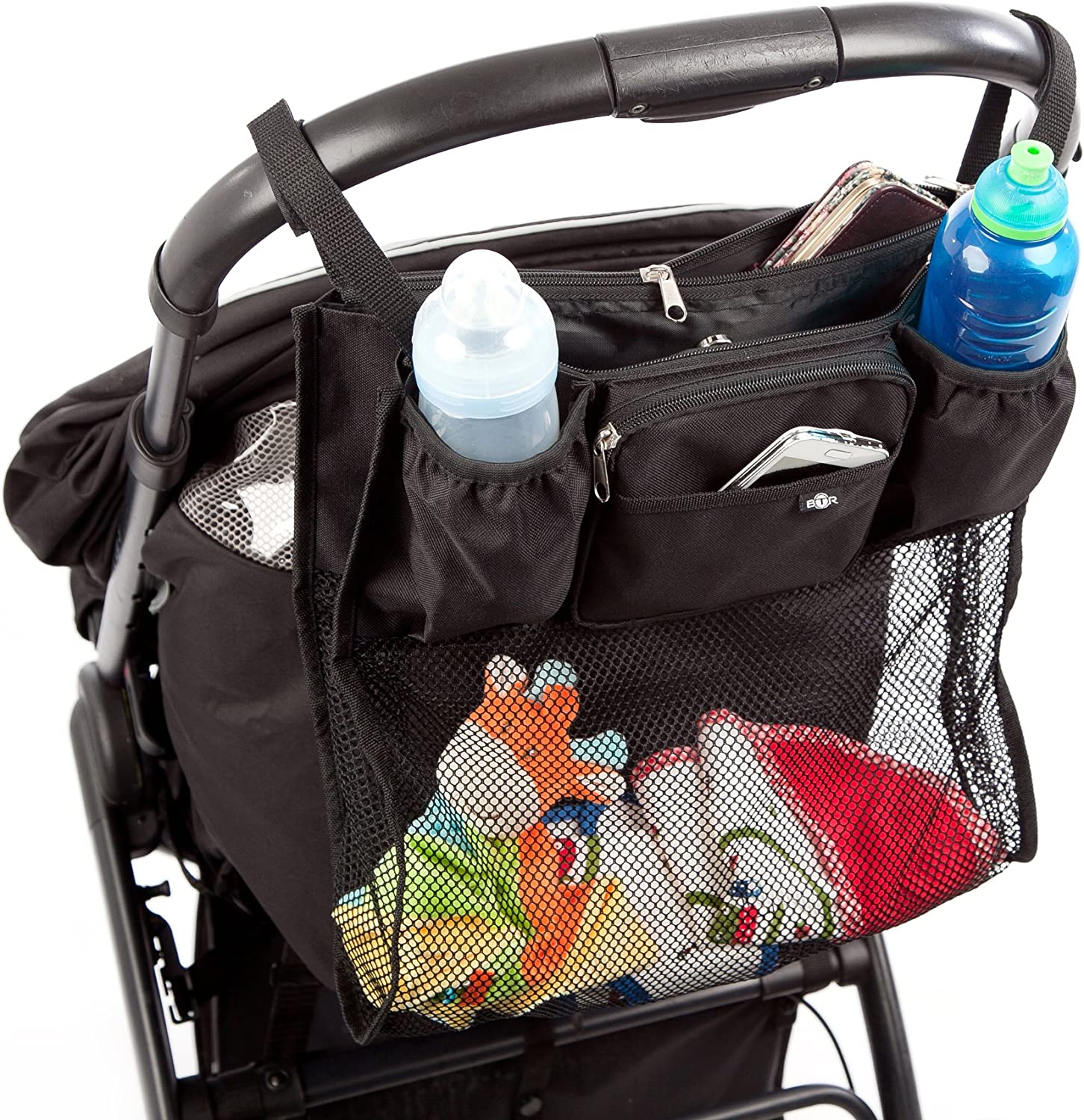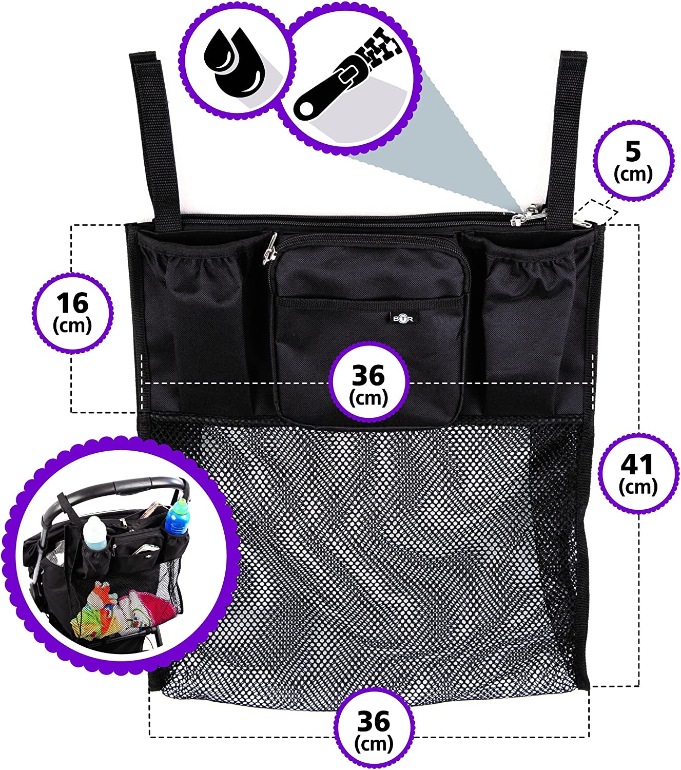 - Universal fit: Designed to fit all prams. Installs in seconds & holds everything that you need. Adjustable straps secure the pram organiser. No need to worry about our stroller organiser fitting your pram – our BTR Slimline Buggy Organiser Shopper fits them all!
