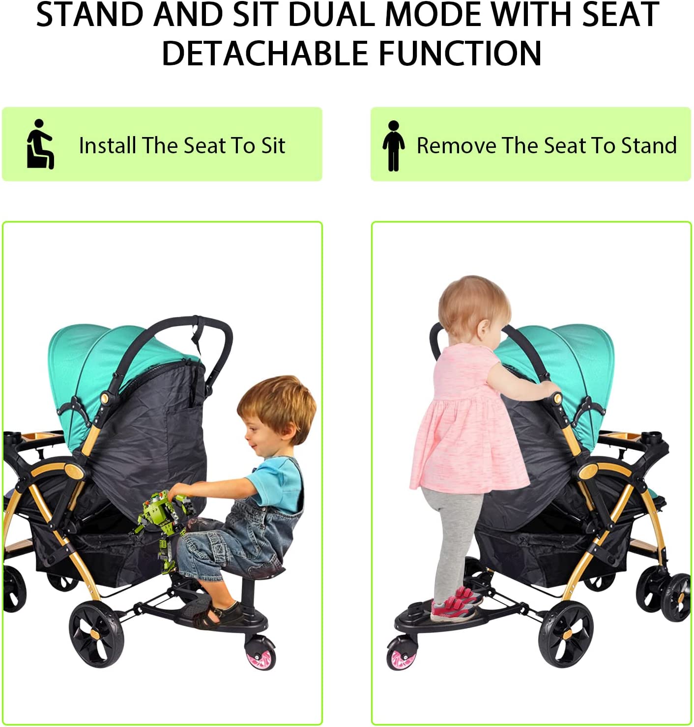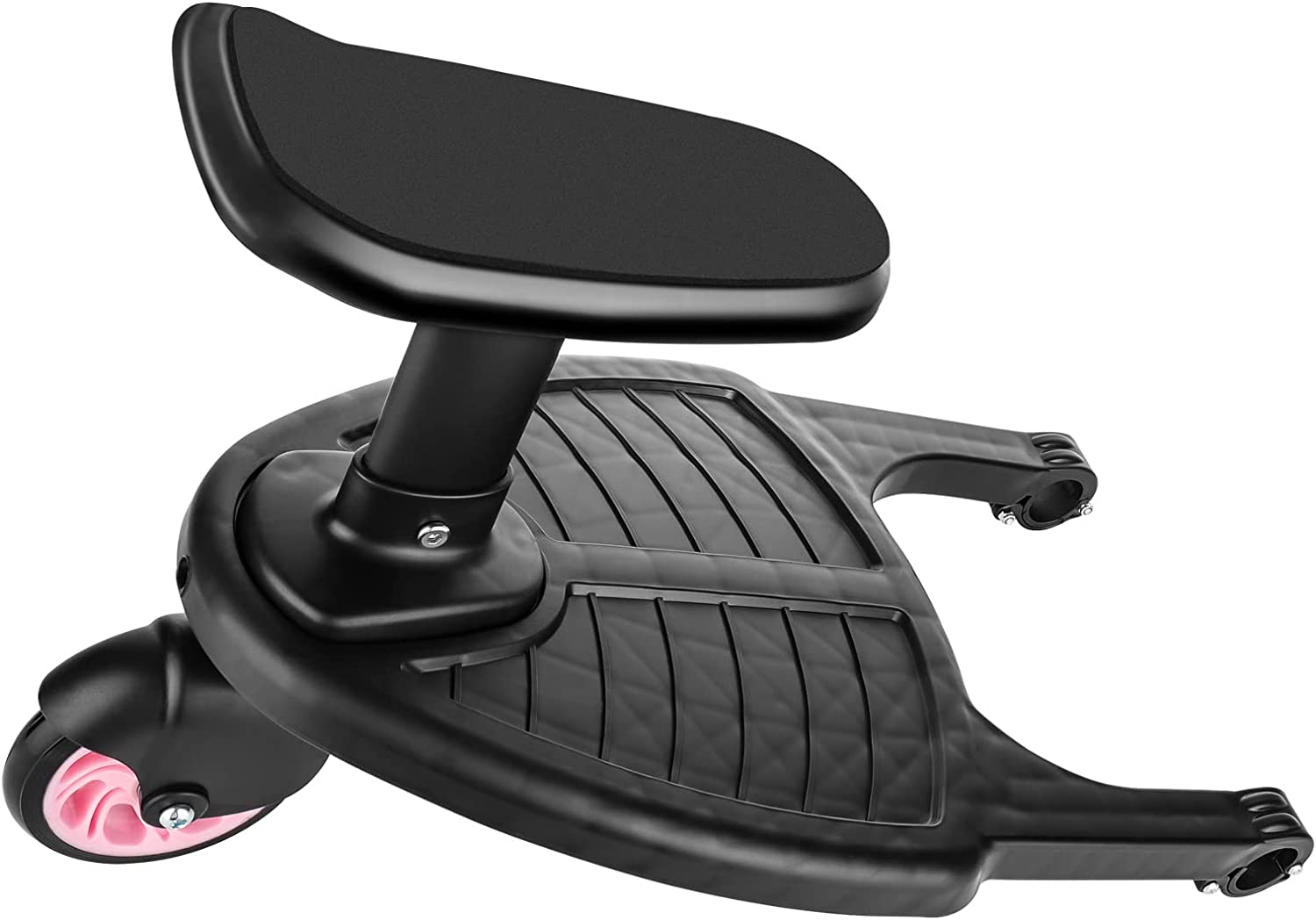 - EXCELLENT WORKMANSHIP: This pram board is constructed with pedals, swivel wheels, and a removable seat. The pedal is made of friendly PP material, with a special textured non-slip design, sturdy and reliable, and suitable for children under 25 kg.The universal wheel adopts the widened and thickened PU universal wheel, which is smooth and wear-resistant and can be easily pushed. The detachable seat is made of EVA material, which is soft and comfortable, making the child more comfortable sitting.