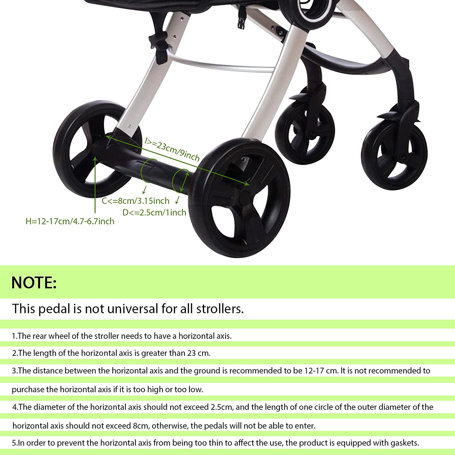 - IMPORTANT NOTE: This buggy standing board is not suitable for all strollers. The rear wheel of the stroller needs to have a transverse axle longer than 23 cm. The recommended distance between the horizontal axis and the ground is 12-17 cm. The diameter of the horizontal axis should not exceed 2.5cm, and the length of one circle of the outer diameter of the horizontal axis should not exceed 8cm, otherwise, the pedal cannot enter. Please check your stroller before buying.