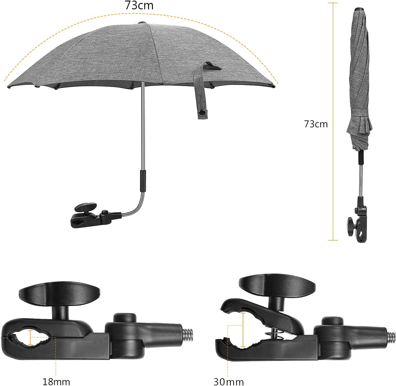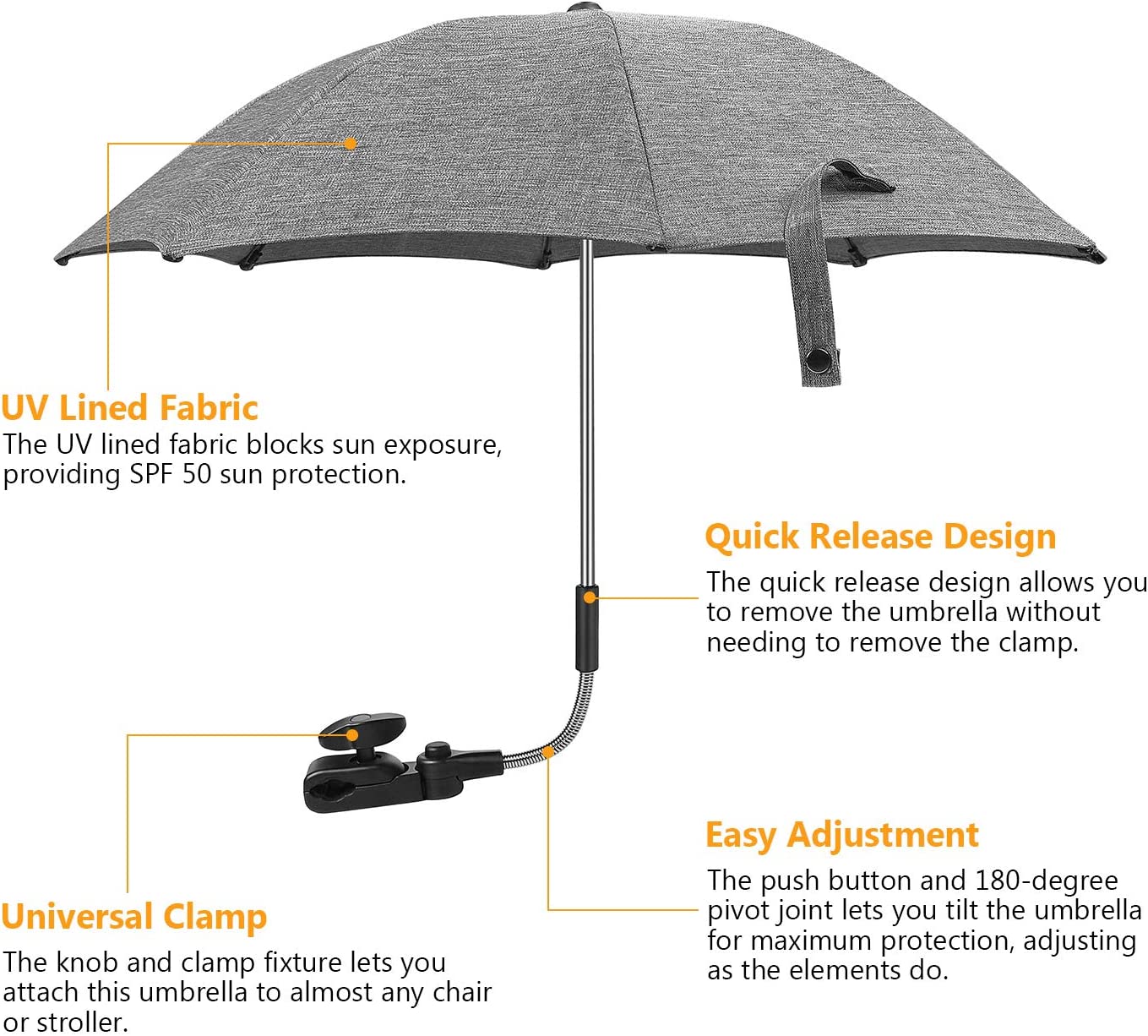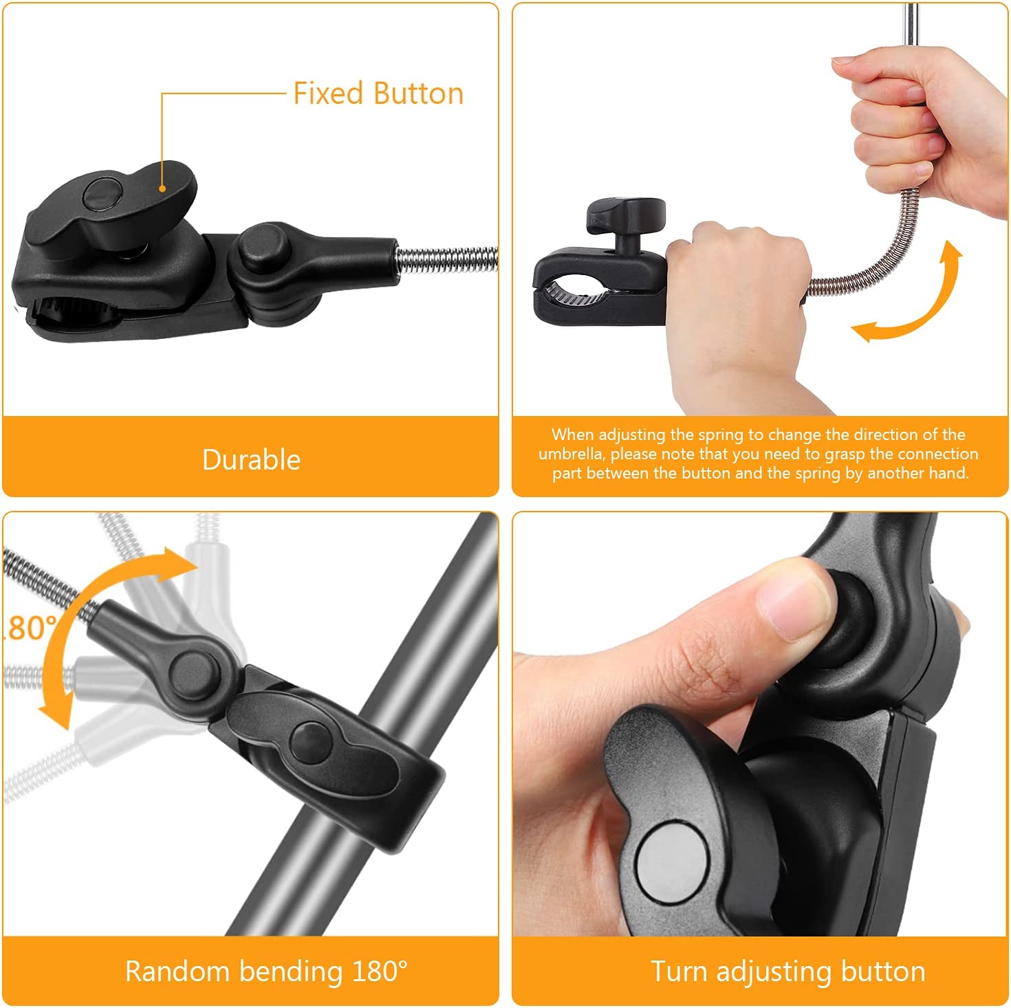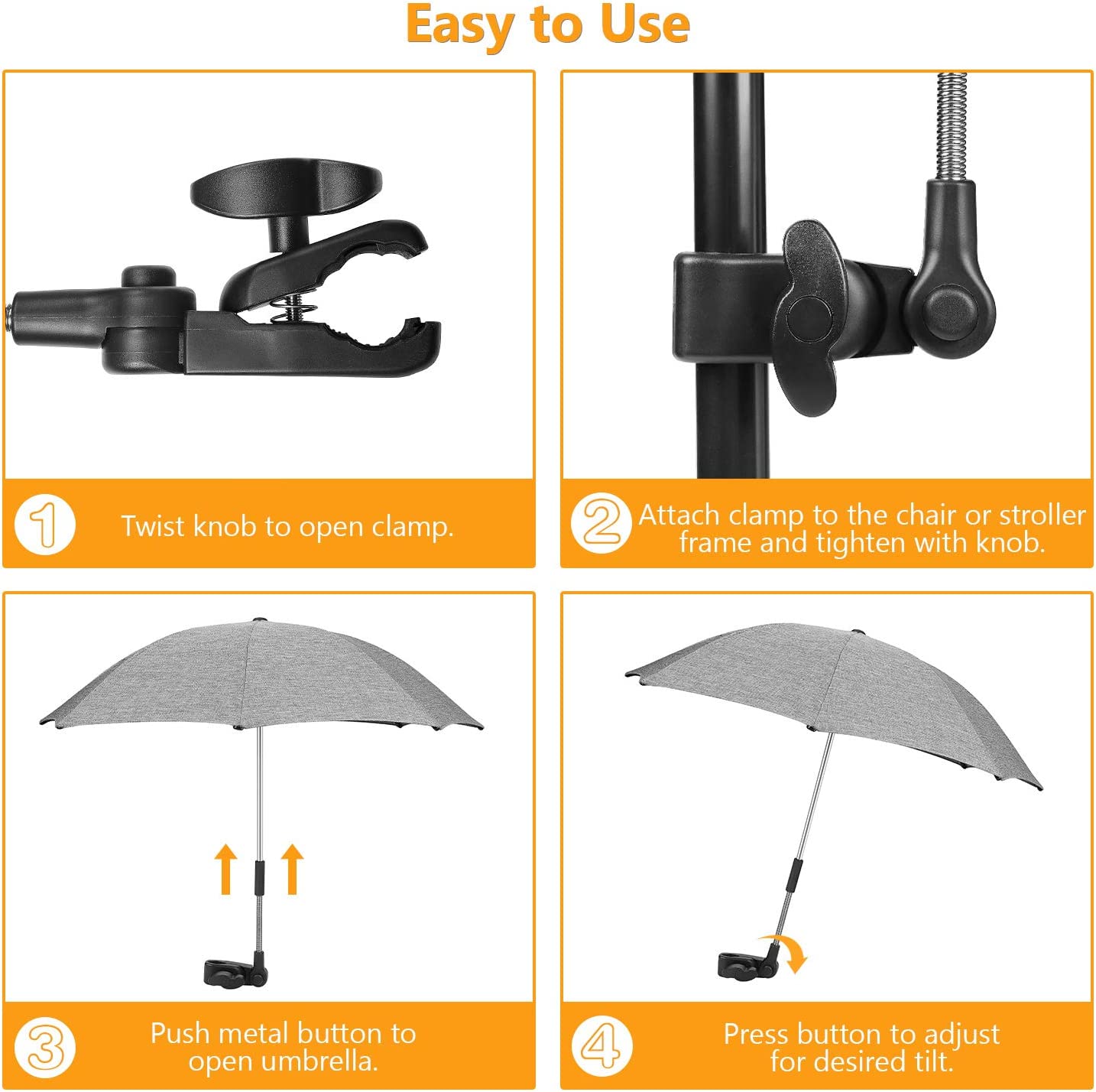 - 3.Flexible and adjustable: With two jaws, umbrella maximum opening adjustable clamp to 3.5 cm. The baby stroller umbrella flexible base and simply bending handle make it easy to adjust the angle for optimal protection from the sun harmful UV rays. Adjustable Umbrella Clip - You can adjust the clip to suit your umbrella holder's diameter.