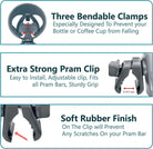 - FIRM GRIP PRAM BOTTLER HOLDER - Our baby clip on pram cup holder and bottle holder, has a strong and steady clip, especially designed to fit on all types of baby buggy bars or wheelchairs. Soft rubber on the inside of the clip to prevent scratches on your stroller or pushchair.
