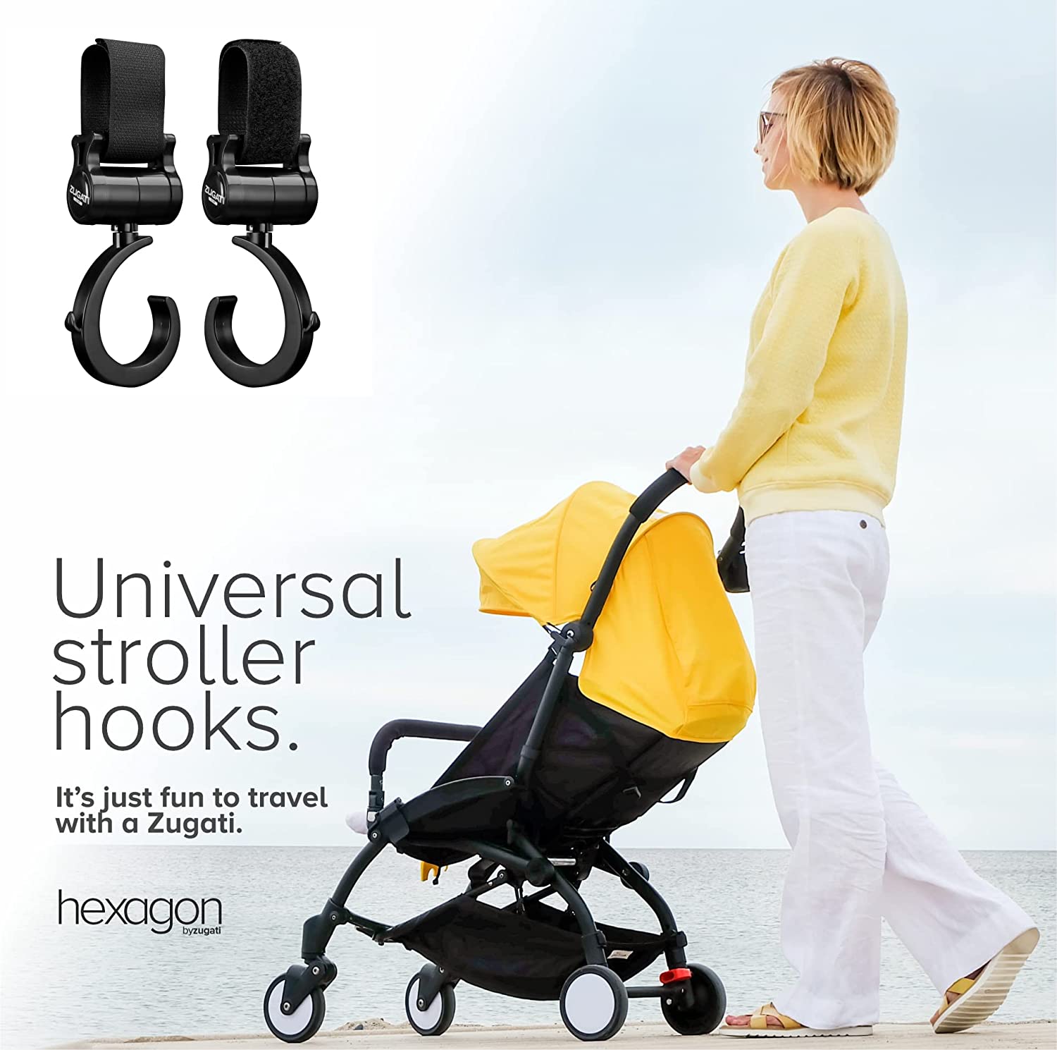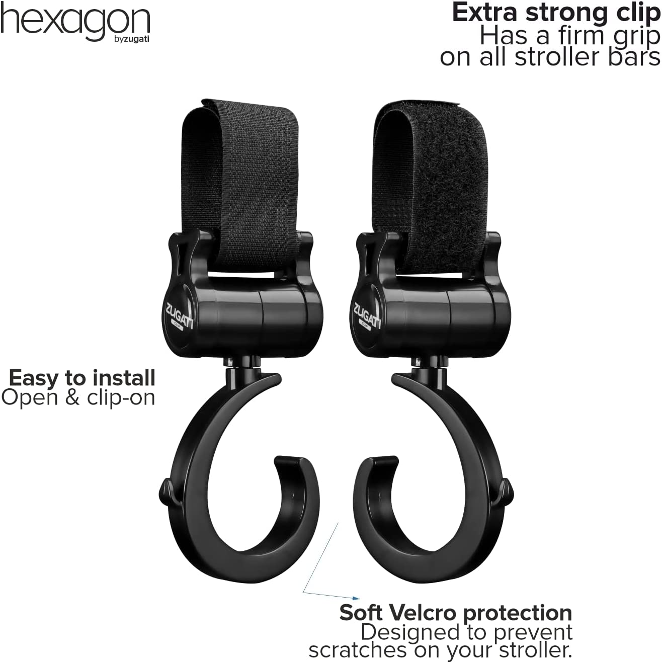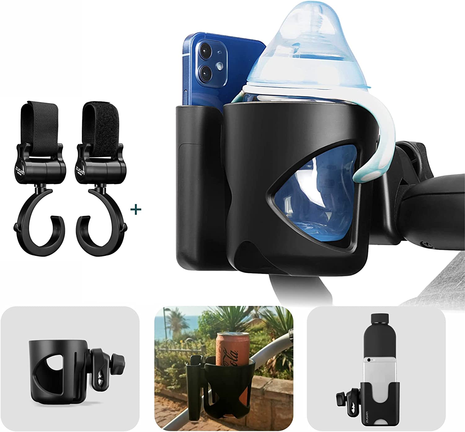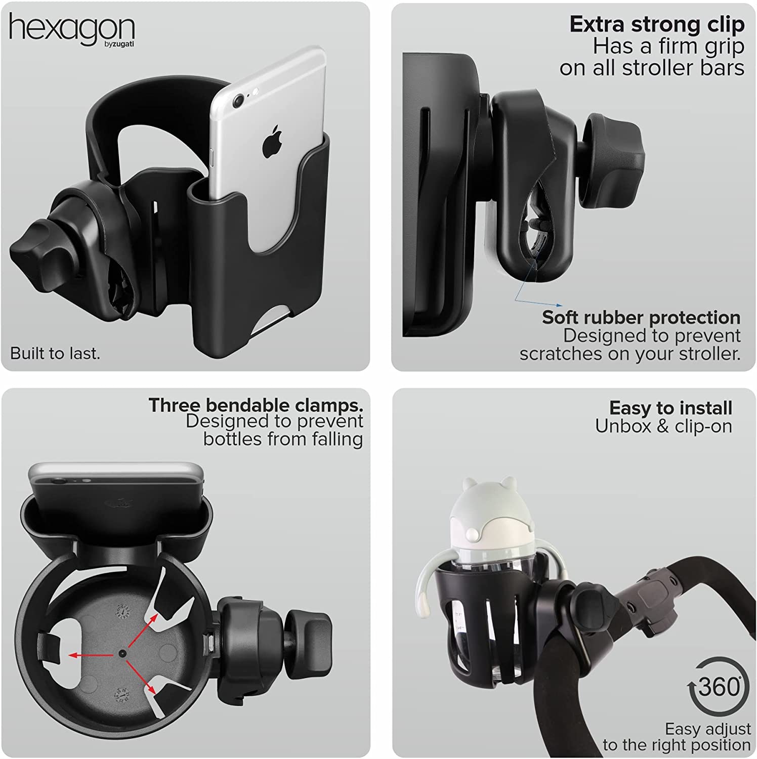 - UNIVERSAL STROLLER CUP HOLDER & BUGGY CLIPS - The Zugati Hexagon stroller organiser is the ideal pram cup holder and phone holder for all buggy brands. The baby bottle holder is our classic award winning buggy cup holder reinvented with a smartphone holder mount to hold your phone near your hands, you can now easily free your hands and focus on your travel journey.