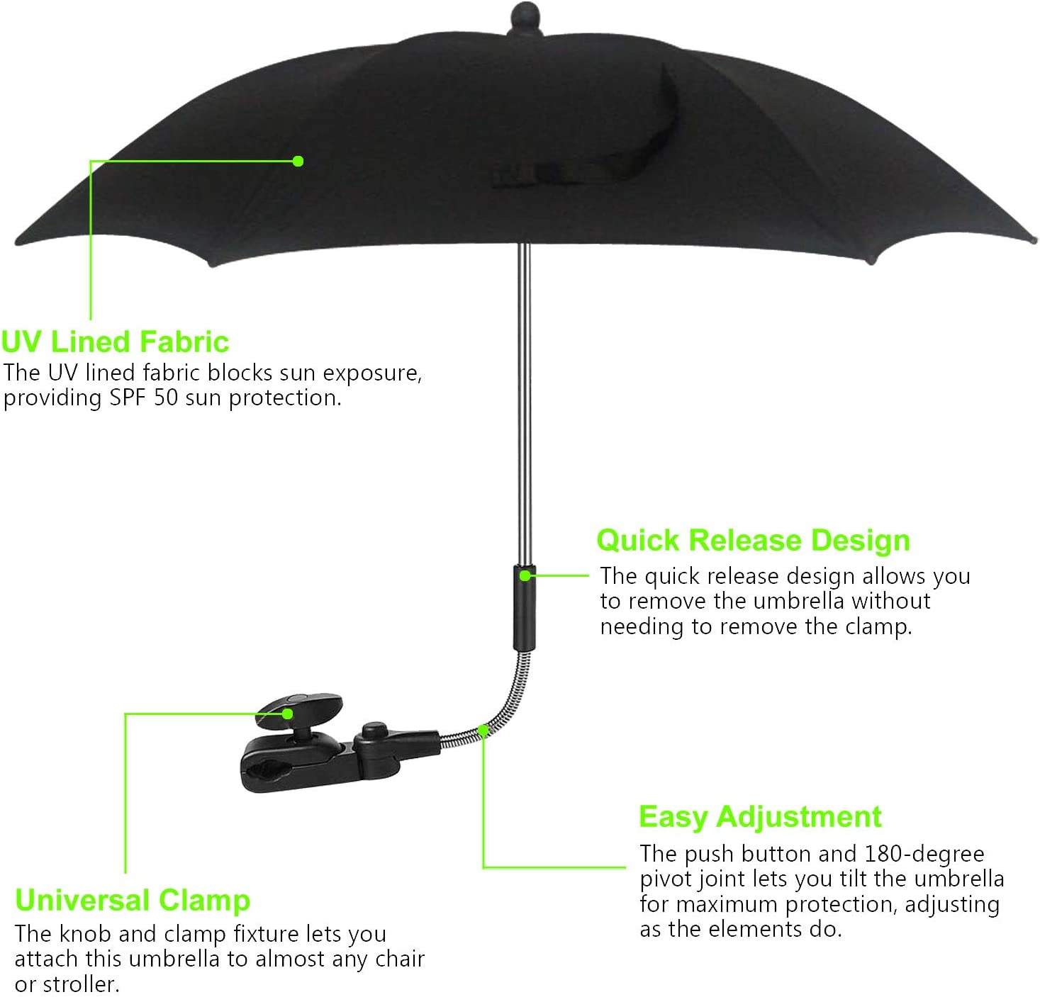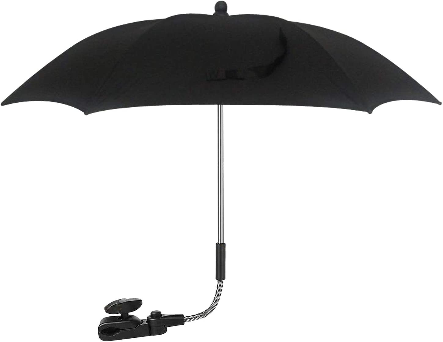 - UV Protection SPF 50+: The PSS parasol 360° fully protects your baby from harmful UV rays. This shielding accessory features a flexible spring section on the top that allows you to bend the stem for easy angle adjustment. The bending profile keeps your baby in the cool shade. Adjust the angled to shade your baby according to actual condition.